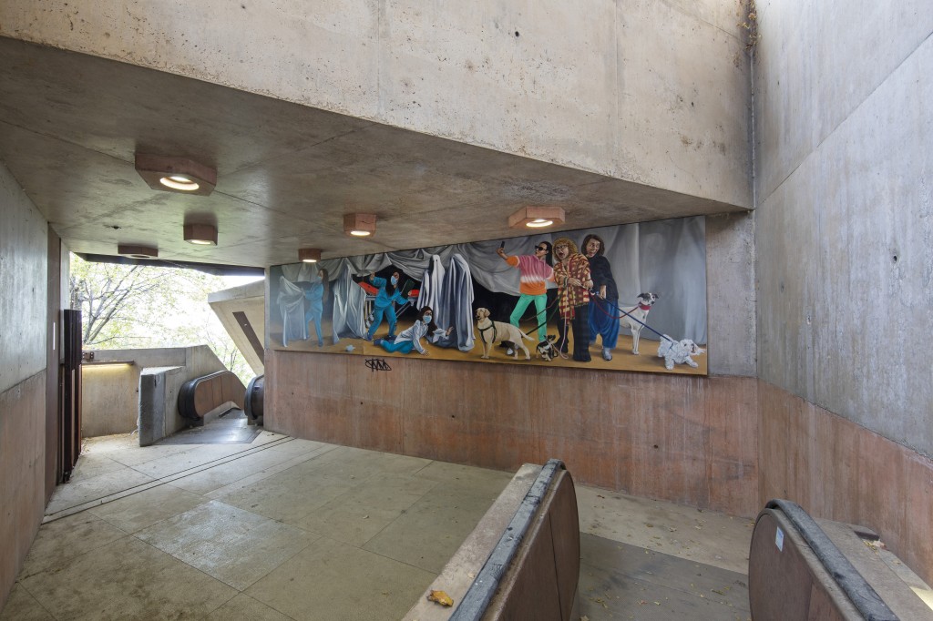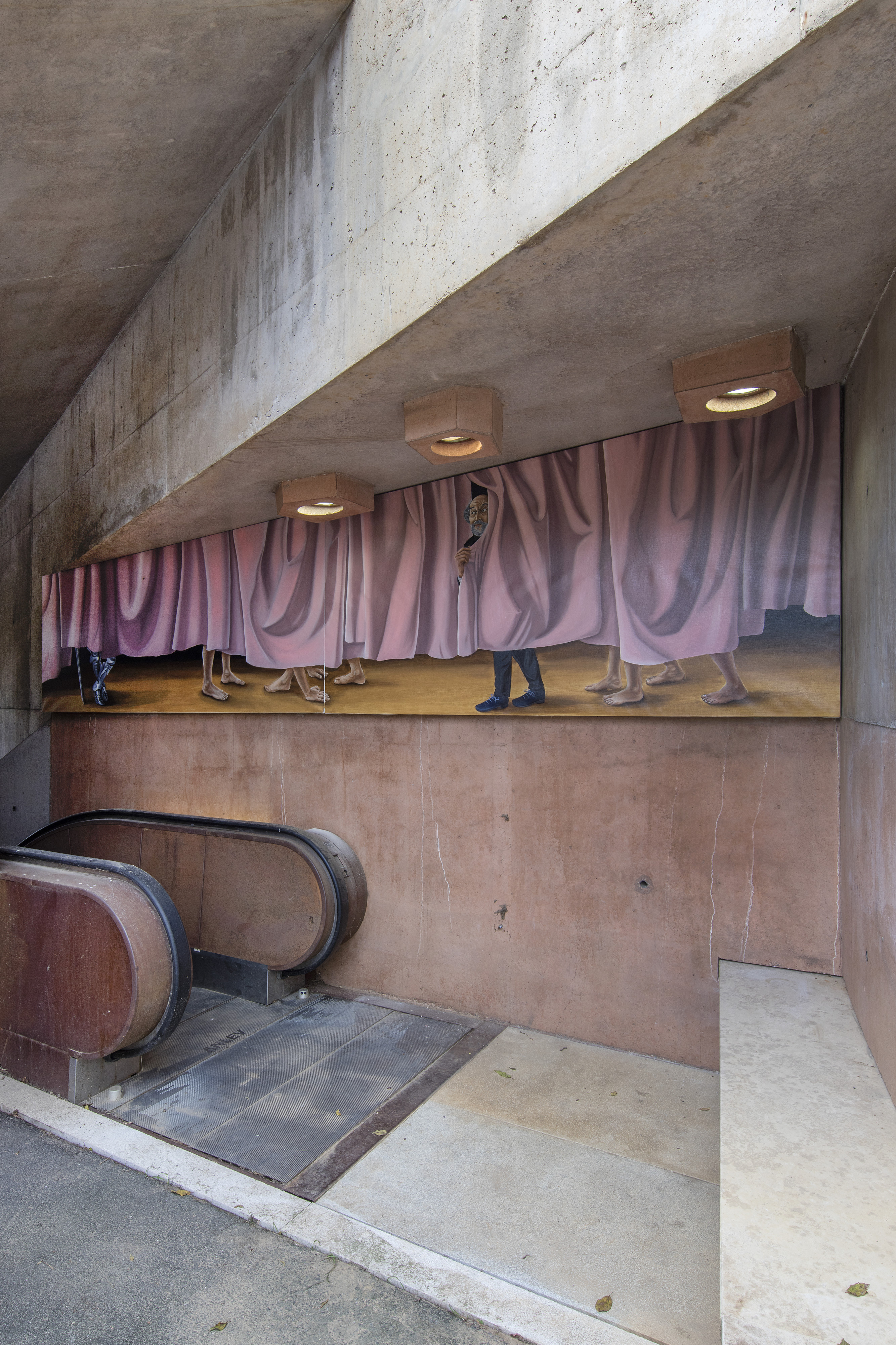 These paintings by Patrizio Di Massimo, realised with the Scenography students of the Albertina Academy of Fine Arts in Turin, dramatically portray the feelings associated with the exhibitionism, mystery, anger and narcissism of the contemporary world. Entitled The Escalator Cycle, they were created by the artist specifically for the spaces of the risalita meccanizzata in Rivoli. Through a series of workshops hosted by Combo in Turin, Di Massimo taught the students his painting method by involving them in all stages of production, as in an ancient artist workshop, from the photography of the characters and composition of the sketches to the actual execution. Altogether, these four large canvases offer an ironic glimpse of today’s society.