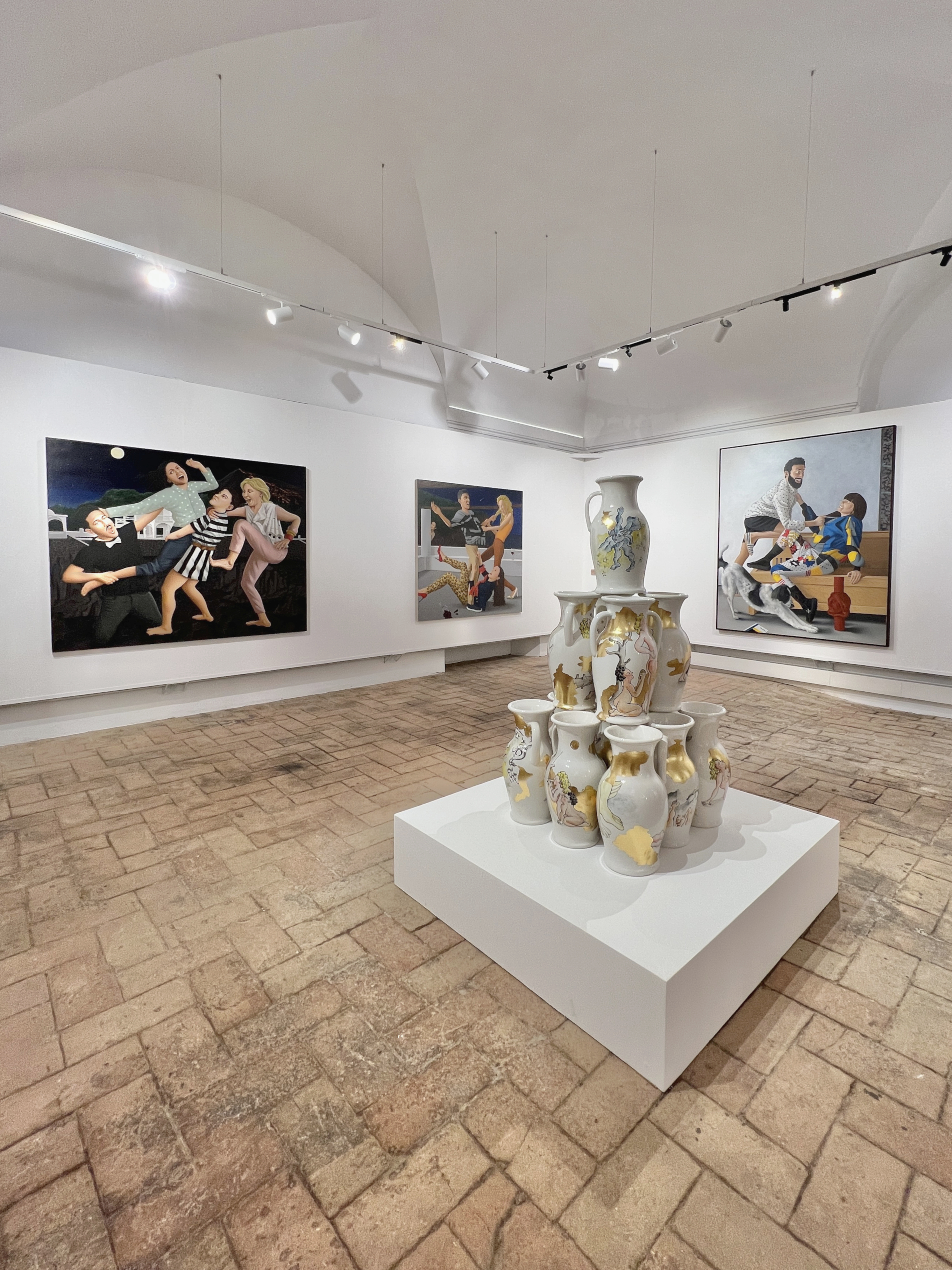 ANTHOLOGY (2013- 2023) brings together twenty-five mainly large-format paintings, together with a series of drawings and a ceramic installation, produced over the last ten years, which witness per exempla the evolution of a pictorial research that combines suggestions taken from 20th century art history (in particular Otto Dix and Christian Schad, but also Achille Funi and Gio Ponti) with an intimate, ironic and grotesque imagery, full of references to a familiar everyday life, revisited in a fantastic and symbolic key.